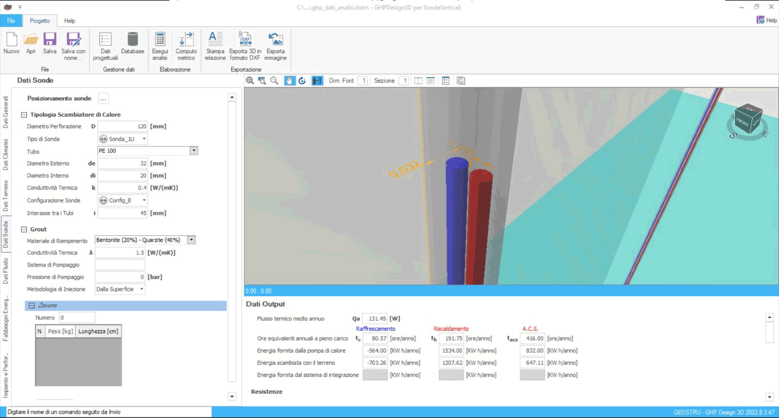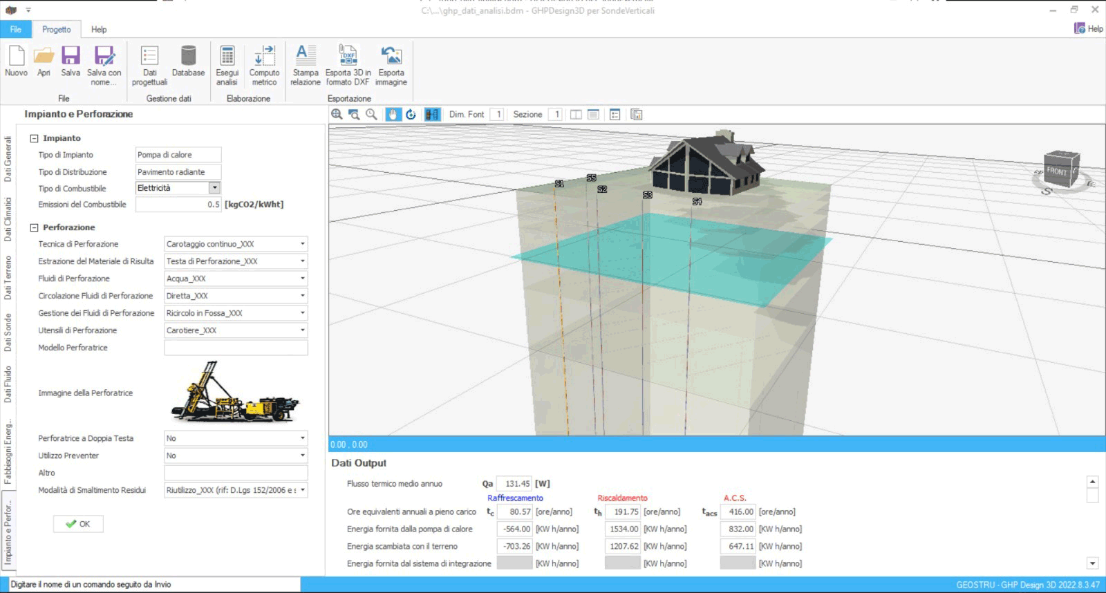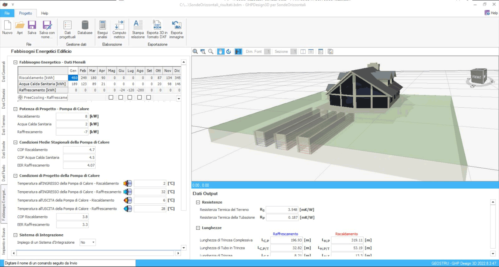 Progettazione impianti geotermici – GHP DESIGN 3D effettua il dimensionamento delle sonde geotermiche sulla base del fabbisogno energetico dell’edificio, delle caratteristiche del terreno e degli scambiatori di calore.